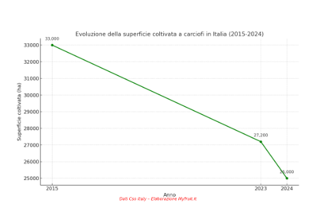 Le parole del manager sardo trovano riscontro nei dati presentati a dicembre scorso da Cso Italy durante un evento di BASF | Nunhems. In Italia, la superficie coltivata è passata da circa 33mila ettari del 2015 a poco meno di 25mila del 2024, con un calo in 10 anni del 25%, contrazione registrata in particolare nell'ultimo biennio nelle principali areali colturali. "Quattro regioni concentrano oggi quasi il 90% della coltivazione del carciofo in Italia: Puglia (43%), Sardegna (25%), Sicilia (15%) e Lazio (4%). Campania, Toscana, Basilicata, Abruzzo, Calabria, Emilia Romagna e Marche rappresentano ciascuna quote variabili tra l'1 e il 3%".