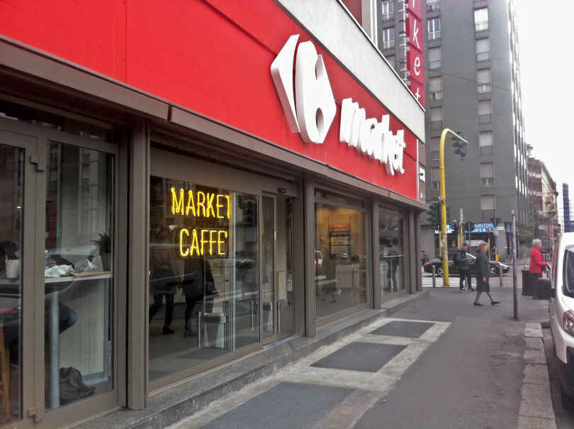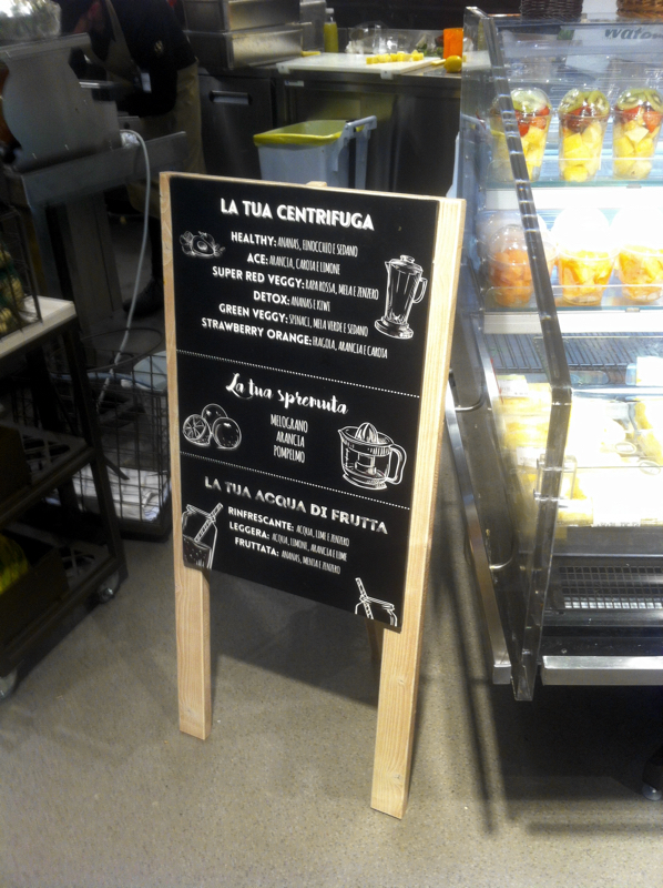 Al primo piano, con vista sul marciapiede, anche un bar con circa 40 posti a sedere, dove è possibile consumare piatti dolci e salati, aperitivo incluso, operativo durante l’orario di apertura al pubblico del supermercato (7 giorni su 7, dalle 8 alle 22).