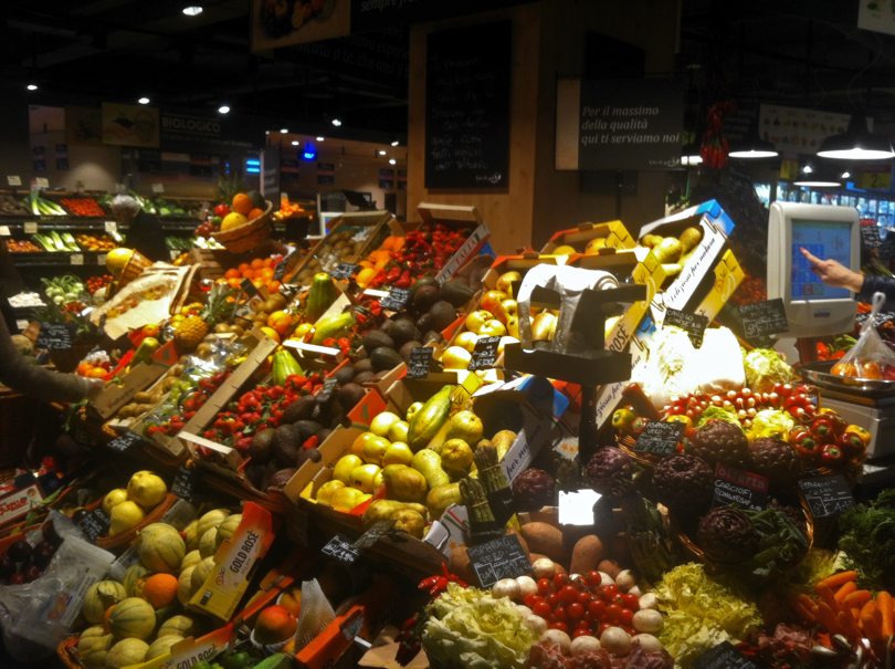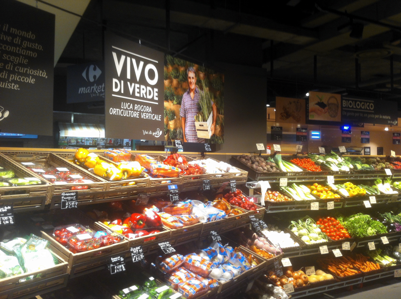 Frutta e verdura biologiche occupano uno spazio molto vasto, tra i più ricchi visti in circolazione sino ad ora: più di 40 referenze, tra confezionato e sfuso, con una bilancia da utilizzare ad hoc, e due testimonial che campeggiano sopra quest’ala del reparto: il noto chef vegetariano Pietro Leeman (una stella michelin con il ristorante Joia a Milano, intervistato anche sul primo numero della rivista Vivi di Gusto) e Luca Rogora, “orticultore verticale”.