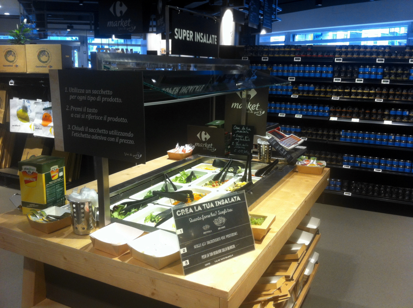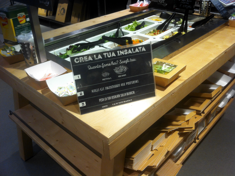 Sempre al primo piano, superate le aree dedicate alla gastronomia, al mondo ittico e quella dedicata al sushi (50 varianti tra self service e on demand) e alla cucina asiatica, un angolo per le “super insalate”: i clienti possono comporle come meglio credono, pesarle e confezionarle.