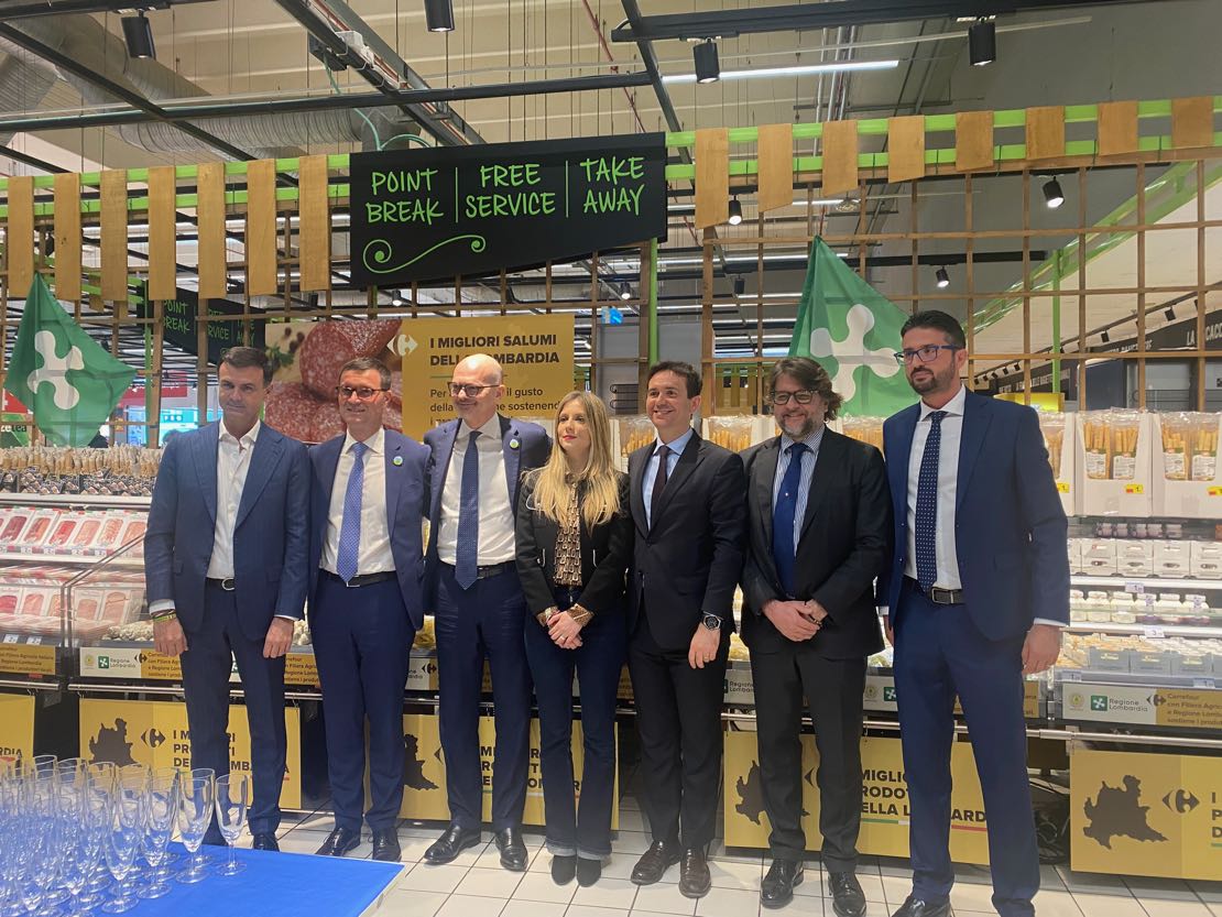Ettore Prandini, presidente nazionale Coldiretti e presidente Filiera Agricola Italiana Spa, Christophe Rabatel, Ceo di Carrefour Italia, Bruno Moro, direttore commerciale di Carrefour Italia, il presidente Commissione e Finanze della Camera dei Deputati, Marco Osnato, i membri Commissione Politiche Ue alla Camera dei Deputati, Grazia di Maggio e Alessandro Cattaneo, e il membro della Commissione Trasporti, Poste e Telecomunicazioni, Fabio Raimondo