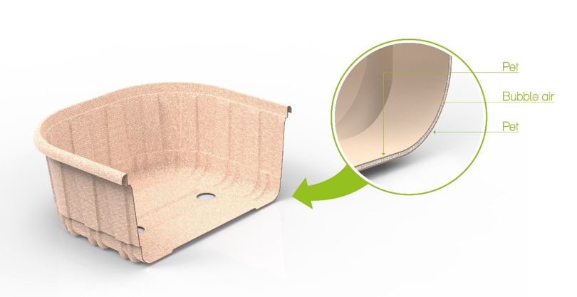 Per l’azienda si tratta di “una nuova frontiera dell’imballaggio termoformato: le bolle d'aria presenti all’interno del nucleo del materiale esaltano il color cartoncino ed inoltre ha una superficie particolarmente liscia che consente ottime riproduzioni grafiche”. La nuova tecnologia utilizzata fa sì che la plastica venga espansa distribuendo con precisione miliardi di bolle microscopiche sotto la superficie, una microstruttura che conferisce al vassoio caratteristiche di leggerezza e isolamento termico.