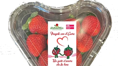 Tra le novità le fragole italiane dedicate a San Valentino confezionate in vaschetta a forma di cuore e sviluppate con la cooperativa sociale Cils di Cesena