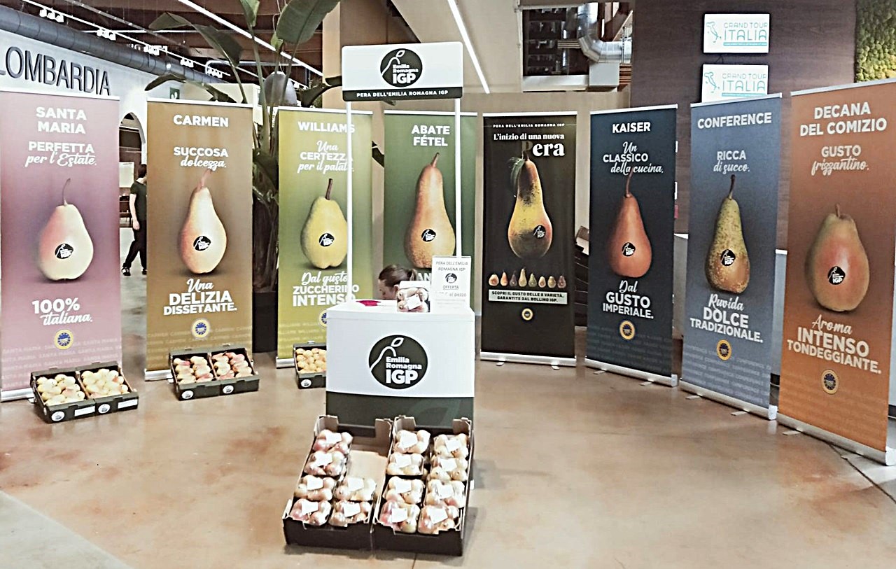 Nella visita a Grand Tour Italia emerge il coinvolgimento del Consorzio della Pera Emilia Romagna Igp. Una postazione all'ingresso, come si vede in foto dove si svolge un’attività di informazione sulle caratteristiche organolettiche del frutto, il suo periodo di produzione e consumo e le sue applicazioni in cucina.