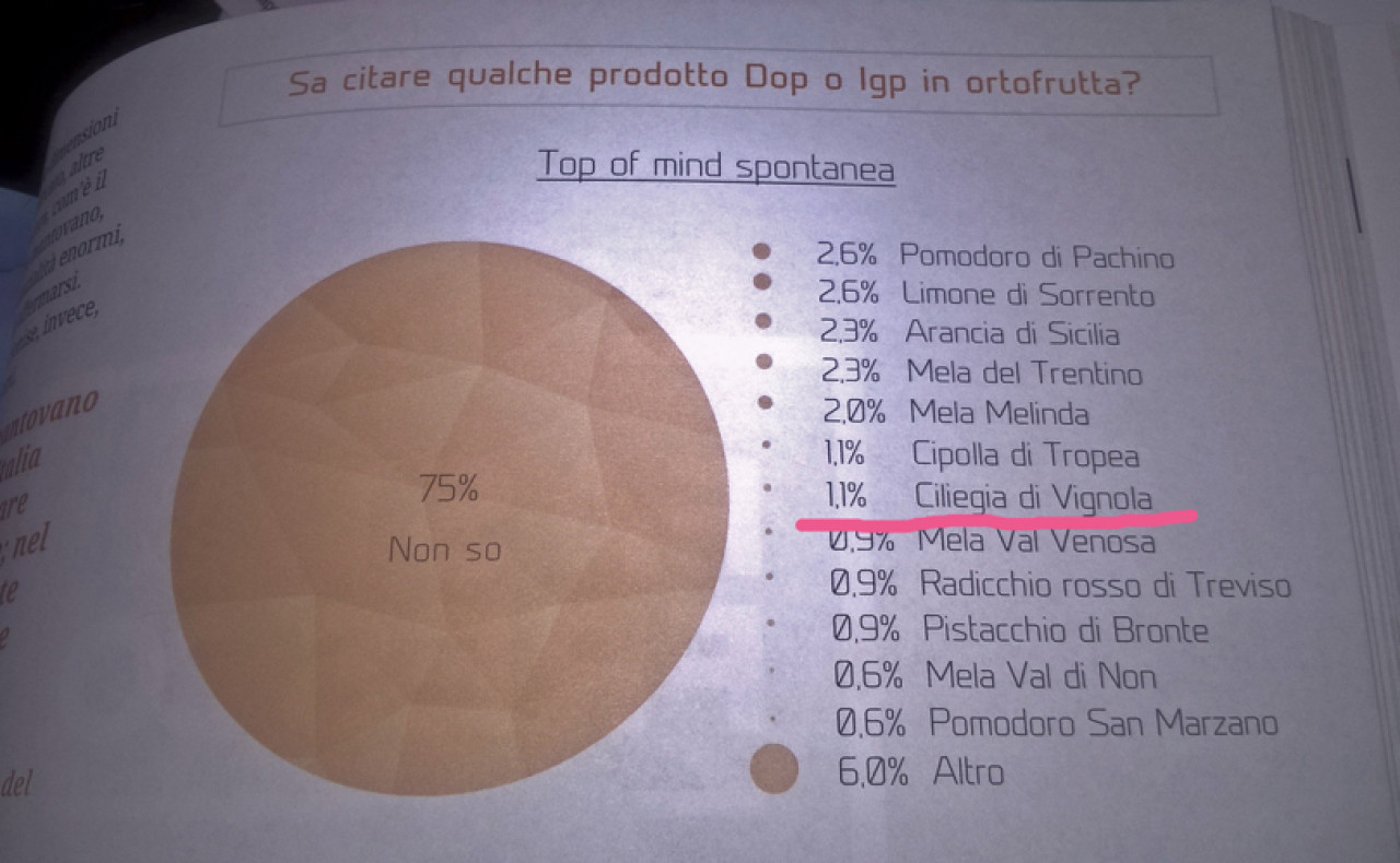 Il brand Ciliegie di Vignola Igp si posiziona al 7° posto tra quelli citati. Un risultato che, al netto del fatto che comunque ben il 75% degli intervistati non è stato in grado di elencare neanche una denominazione del settore ortofrutticolo – vede questa grande specialità in una posizione di tutto rispetto all’interno del nutrito gruppo di prodotti ortofrutticoli Dop e Igp (106 al 2015 secondo l’ultimo Rapporto Ismea/Qualivita) che esistono in Italia. Al di sopra anche di nomi molto prestigiosi del settore, come il radicchio rosso di Treviso Igp, o altri che neanche compaiono nell’immagine (vedi sopra) del volume, come la pera dell’Emilia Romagna Igp, l’uva da tavola di Mazzarrone Igp, la patata di Bologna Dop o ancora la ciliegia di Marostica Igp.