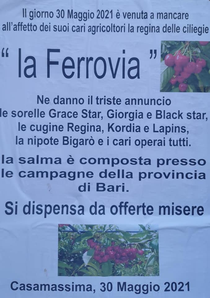 Casse di ciliegie buttate a terra davanti a un centro di conferimento e il Comune, i muri del paese tappezzati da manifesti listati a lutto che annunciano la morte della varietà “Ferrovia”, un agricoltore che urla e protesta a beneficio dell'inevitabile video/post che fa il pieno di like e commenti sui social. Siamo in provincia di Bari. Nel comune di Casamassima che, insieme a quelli vicini di Turi e Conversano, è uno dei principali del territorio barese dedicato alla coltura del ciliegio. Siamo alle solite. L'anno scorso abbiamo visto un contadino tagliare con la motosega un albero carico di albicocche. Un'altra conferma di questa triste situazione arriva dai commenti su Facebook e dal post del sindaco Giuseppe Nitti. Un ritornello che si ripete puntualmente, anche se quest'anno cambia d'intensità. Per il primo cittadino la soluzione è l'aggregazione dei piccoli produttori.