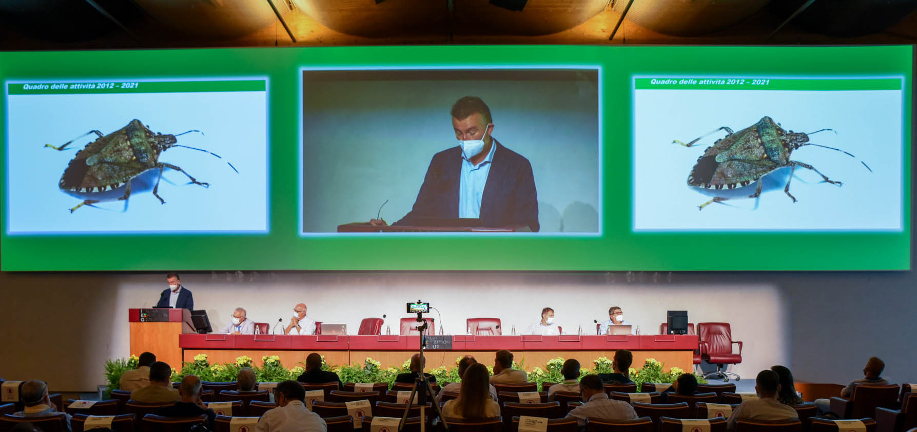 Ha aperto i lavori Luca Casoli, direttore Consorzio Fitosanitario di Modena e Reggio-Emilia, ponendo l'accento su una problematica, quella della cimice asiatica in agricoltura, diventata “la più critica in assoluto in questi anni per il settore”. Il direttore ne ha ripercorso la storia: “Ci troviamo di fronte a una specie che ha avuto fluttuazioni nel corso delle varie stagioni. È arrivata nel 2012, dal 2014 ci sono state le prime avvisaglie e i primi danni, fino ad arrivare al 2019, l'anno più nero. E' stato infatti caratterizzato da una precoce uscita dallo svernamento con una elevata percentuale di sopravvivenza delle cimici associata a un clima favorevole. Il Comitato fitosanitario nazionale ha poi approvato un programma di lotta biologica coordinato dal Crea, autorizzato poi nel 2020, che ha consentito la creazione di un percorso di contenimento della specie a livello territoriale. Nel 2020 abbiamo predisposto 300 siti di allevamenti di cimici con due momenti di rilascio (giugno e luglio), nel 2021 si è ripetuta questa esperienza in maniera mirata in cento siti: i rilasci sono stati nelle zone delle colture frutticole, punti dove si moltiplicano più facilmente. Stiamo attualmente effettuando lo stesso rilievo a livello territoriale ma abbiamo già riscontrato una parassitizzazione generale superiore al 38% derivante dal complesso dei parassitoidi, e un 8,1% di ovature di vespa samurai. Un segnale importante dal punto di vista della coesistenza tra parassitoidi e la vespa samurai”.