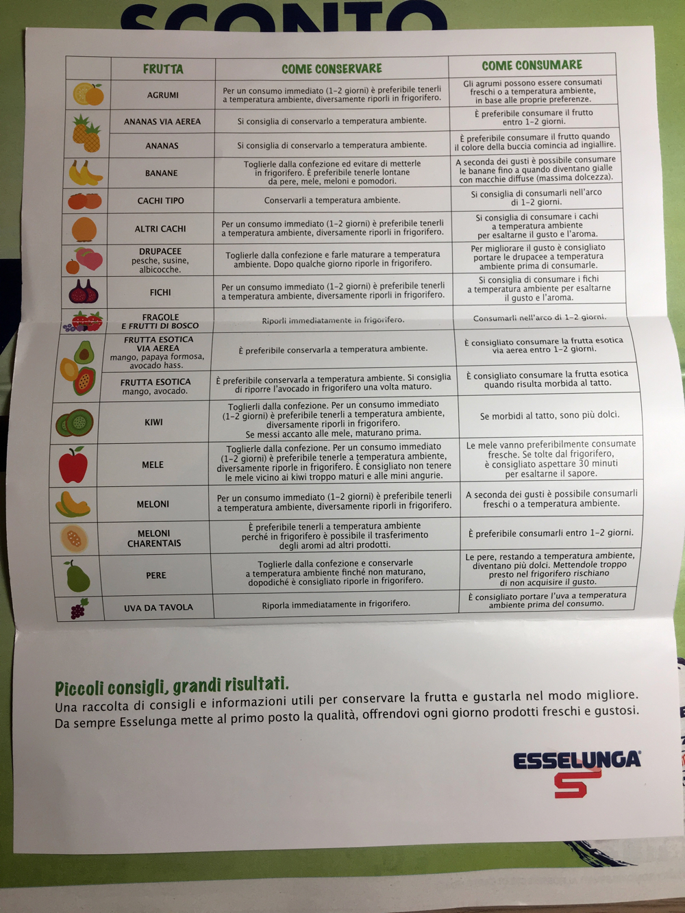 L'idea non è certo nuova, ma sicuramente è sempre utile. Da qualche giorno nei punti vendita Esselunga, sono in distribuzione gratuita nei reparti ortofrutta dei volantini pieghevoli – forse non posizionati proprio benissimo, quanto meno nel punto vendita che abbiamo visitato noi – dal titolo: “I buoni consigli fruttano“.