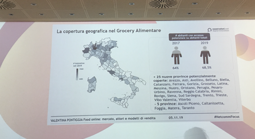 Definito da Roberto Liscia, Presidente di Netcomm, una sorta di “8000 metri” dell'e-commerce – vista la difficoltà di operare in un settore come quello alimentare, fresco incluso – il mondo del food&grocery è il settore che cresce di più in Italia orami da tempo: nel 2019 l'analisi parla di un ulteriore balzo del 42% rispetto al 2018, pari al 5% circa del totale e-commerce in Italia e pari a circa 1,6 miliardi di euro. Certo, la penetrazione della spesa on line rispetto all'off line continua ad essere bassa, pari all'1,1%, inferiore rispetto a molti altri paesi sia europei che del mondo, così come, rimanendo in Italia, inferiore rispetto a settori come l'informatica (27%), l'editoria (21%) o l'abbigliamento (9%).