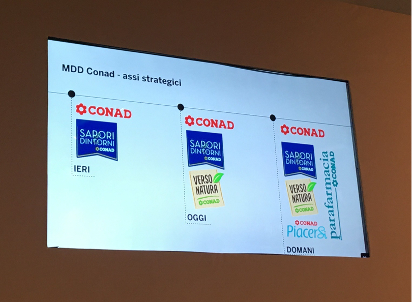 «Cresciamo in modo sano su direttrici rilevanti» afferma Pugliese, che sottolinea il ruolo sempre più importante dei prodotti a marchio, arrivati a pesare il 30%. E come mostra Avanzini, Conad punterà sempre di più sui prodotti Mdd: già ora valgono 3,5 miliardi, crescono del 7% a valore e pesano per più del 50% della crescita di tutta la Marca commerciale in Italia. Nella strategia di Conad giocano un ruolo importante sia quelli che portano il nome dell'insegna e che puntano sul rapporto qualità-prezzo, sia le linee premium “Sapori e Dintorni” e quelle dedicate al biologico e “Verso Natura”, ma sempre più importanza verrà data alla linea ribattezzata “Conad PiacereSì”, che in futuro raggrupperà tutte le nuove tendenze e secondo Avanzini diventeranno trainanti all’interno del paniere dei prodotti a marchio di Conad insieme a quelli del segmento parafarmacie.