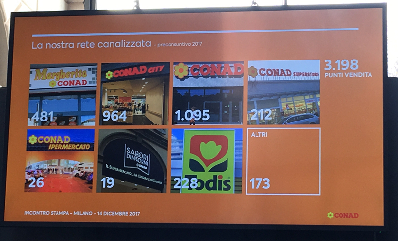È uno stato di salute decisamente ottimo quello mostrato da Conad a Milano durante la presentazione alla stampa del preconsuntivo di fine anno che si è tenuta nei restaurati spazi dell'ex Dazio di Ponente dell'Arco della Pace. Sul palco i manager del gruppo, a partire dall'amministratore delegato e direttore generale Francesco Pugliese (vedi qui alcuni dei punti salienti della sua introduzione), e poi Francesco Avanzini, direttore commerciale di Conad, Alberto Moretti, direttore marketing canali distributivi, Giuseppe Zuliani, direttore customer marketing e relazioni esterne, nonché Alberto Piglia, responsabile e-Mobility della Divisione e-solutions di Enel, che ha illustrato l'accordo siglato con Conad.