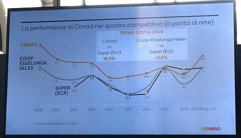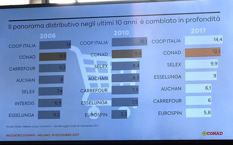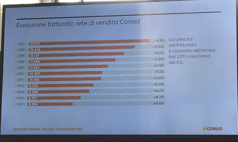 “Conad chiude il 2017 con un giro d’affari di 13 miliardi di euro, 600 milioni in più rispetto all’anno scorso. L’incremento è del 5%, il doppio del mercato previsto in chiusura al 2,5% (fonte: Nielsen Trade*Mis – Stime Nielsen su dati AdEx). La quota di mercato è salita al 12,1% (era il 9,5% nel 2006) e si rafforza la leadership nei supermercati, al 21% (12,7% nel 2006) (fonte: GNLC I° semestre 2017). In crescita anche il patrimonio netto, passato a 2,4 miliardi di euro, 180 milioni in più rispetto al 2016″.