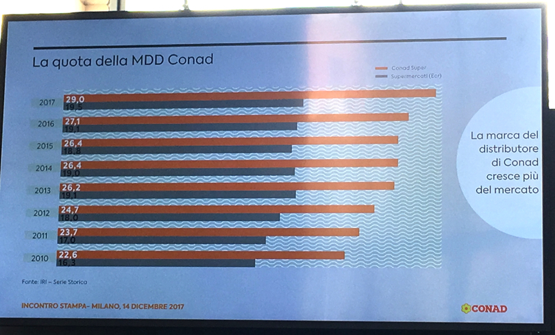 Ci sono poi i prodotti a marchio, fiore all'occhiello di Conad, che crescono molto più del mercato: la quota nel Largo Consumo Confezionato si attesta al 29% contro il 19,5% del valore medio dei supermercati (fonte: IRI, progressivo a ottobre 2017). Prodotti che hanno generato un fatturato di 3,2 miliardi di euro (200 milioni in più rispetto al 2016).