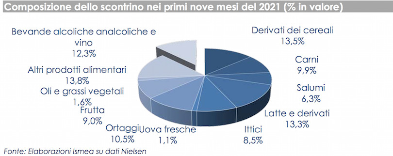 Quanto ai canali di vendita, i supermercati si confermano il primo luogo di approvvigionamento delle famiglie (vi è transitato il 41% dei volumi totali), ma a farsi notare sono i discount. I quali, con una quota del 14%, continuano a rappresentare la categoria con crescita maggiore: +12% rispetto al 2019.