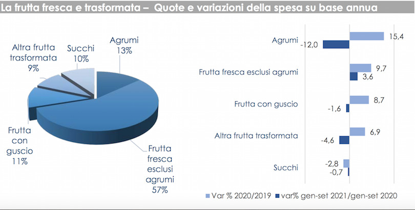 Confermano il trend positivo i prodotti ritenuti salutari: +39% avocado, +34% mirtilli e +15% mandorle. A proposito di queste ultime, resta vivo l’interesse per la frutta a guscio, che rappresenta il 12% del comparto in valore. Tuttavia, dopo l’incremento dell’8,7% nel 2020, la spesa nei primi nove mesi del 2021 si contrae dell’1,6%, per via di un ridimensionamento dei prezzi medi di vendita (noci e mandorle registrano flessioni di prezzo nell’ordine del 13%). In flessione l’interesse per la frutta trasformata: -4,6% per le conserve e -0,7% per e i succhi di frutta (già in negativo nel 2020).