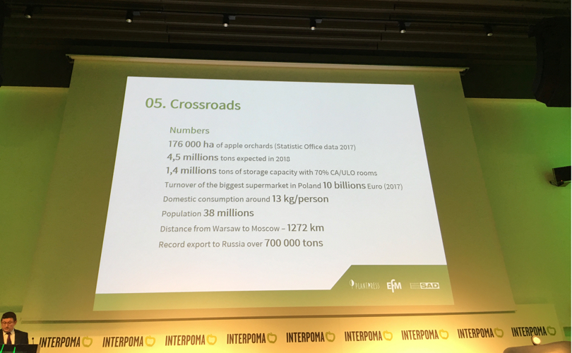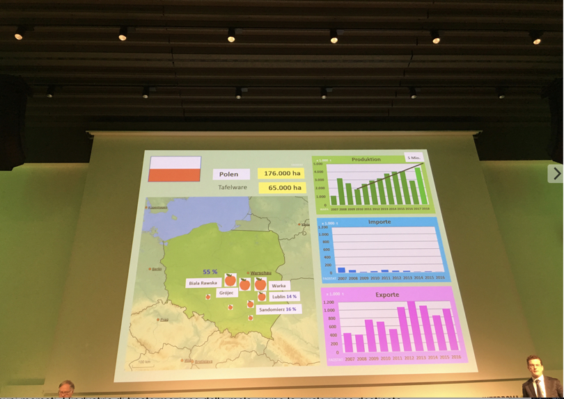 La Polonia, il gigante della produzione melicola europea, secondo al mondo solo alla Cina e che quest’anno sembra spaventare un po’ tutti vista la piena produzione che contraddistingue il suo raccolto, è ormai un osservato speciale qui a Bolzano. In realtà, però, il quadro emerso dalla relazione di Adam Paradowski (Plantpress Sp.zo.o) mostra un paese nel quale il processo di assestamento dopo l’inizio dell’embargo russo del 2014, principale polmone di sfogo della produzione locale, è ancora, come è normale che sia, decisamente in fieri. Se Idared e Janagold/Red Prince rappresentano il 50% della produzione polacca, l’esigenza di spostarsi su altre varietà che vadano incontro ai gusti di paesi all’interno dei quali la Polonia sta cercando di entrare, è un’esigenza che secondo Paradowski rappresenta un obiettivo non più procastinabile, poiché già ora molte mele non conviene neanche più raccoglierle dalla pianta vista la scarsa o nulla richiesta di alcuni mercati.