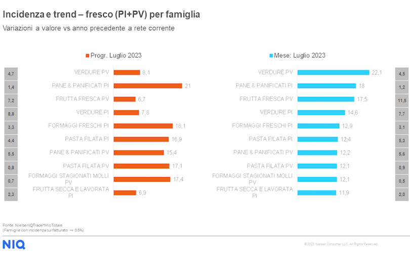 Infine, guidano la classifica Top10 di NielsenIQ del mese di luglio 2023 le verdure a peso variabile (+22,1%), pane e panificati a peso imposto (+18%) e la frutta fresca a peso variabile (17,5%).