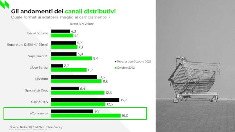 I dati raccolti da NielsenIQ rilevano che a ottobre 2022 il fatturato progressivo – ovvero da gennaio ad oggi – dell’e-commerce è pari a 1,6 miliardi di cui 156 milioni registrati nel solo mese di ottobre. L’andamento del canale online in valore è positivo del +9,7% nel progressivo, mentre balza al 16%, se si considera la crescita del solo mese di ottobre (vs 2021).