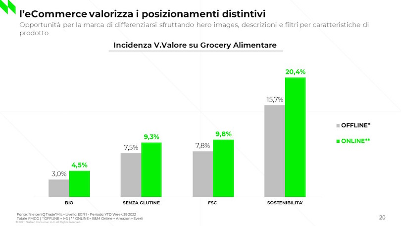 I risultati dello studio di NielsenIQ evidenziano che l’e-commerce valorizza più del canale offline i prodotti caratterizzati da un posizionamento distintivo, cioè quelli che presentano delle caratteristiche specifiche che li differenziano dai concorrenti. La quota a valore nel carrello online è infatti più alta rispetto a quello offline dei prodotti Sostenibili (20,4% vs 15,7%), biologici (4,5 vs 3%), senza glutine (9,3 vs 7,5%) e a marchio fsc (9,8 vs 7,8%), cioè i prodotti realizzati con un uso responsabile delle risorse forestali.