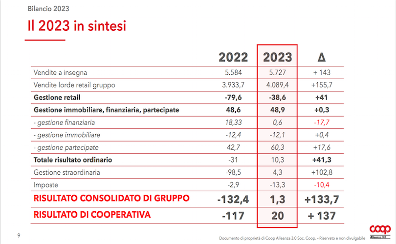 Nel corso del 2023 Coop Alleanza 3.0 ha registrato un aumento delle vendite a insegna che, con una crescita di 143 milioni rispetto al 2022, consentono di chiudere l’anno a 5,73 miliardi, e un risultato della gestione retail in sensibile miglioramento (+41 milioni di euro rispetto al 2022) caratterizzato da vendite lorde retail di Gruppo in crescita (+155 milioni di euro, anno su anno) e Ebitda (margine operativo lordo) positivo e in forte crescita, sia per quanto riguarda la Cooperativa (85 milioni di euro) sia per quanto riguarda il consolidato (194 milioni di euro).