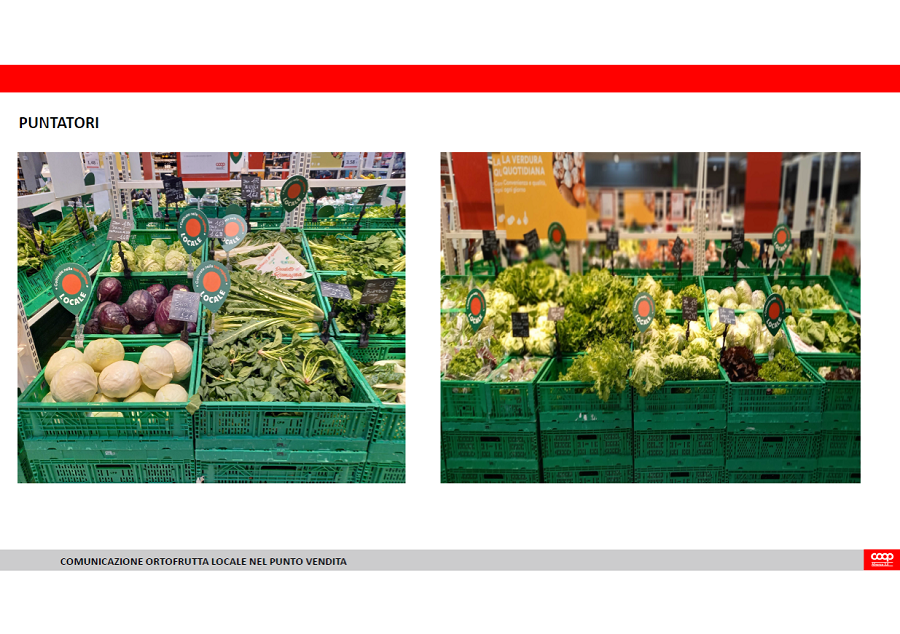 Fornitori geolocalizzati alla Coop. Nel reparto ortofrutta tra un prodotto e l'altro spunta, ogni tanto, un puntatore verde alla Google Maps per dare un segnale forte al cliente: cibo fresco della tua regione, della tua provincia o del tuo comune.