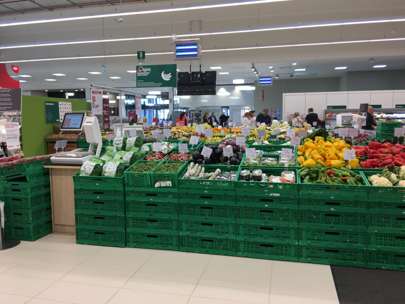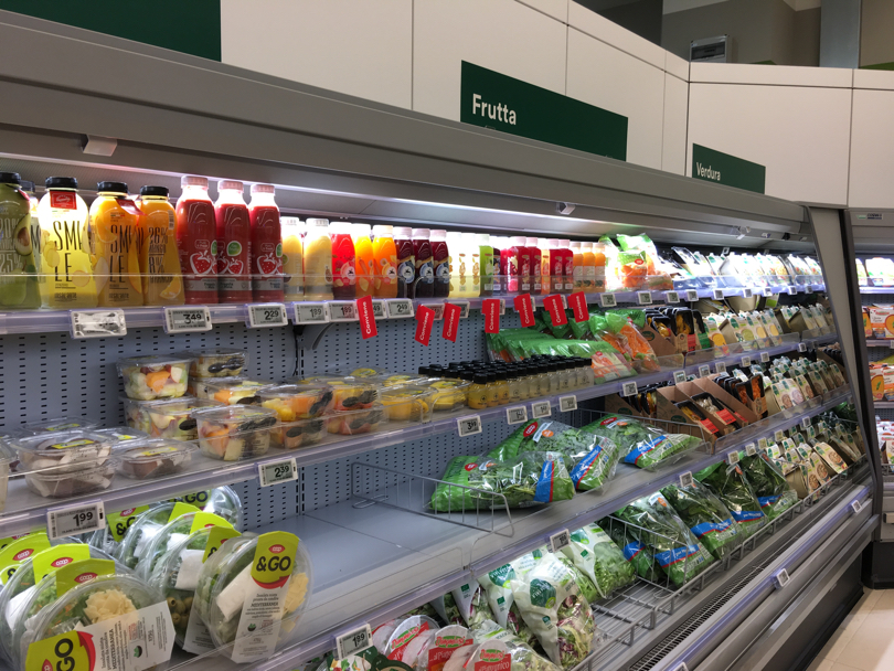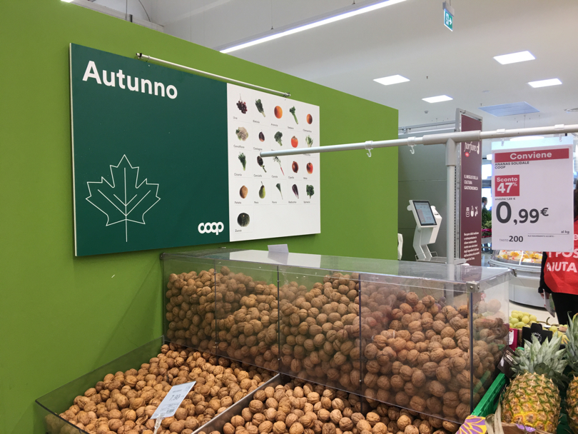 Ambiente caldo ed accogliente, posizione classicamente ad inizio negozio, ampio spazio a IV gamma, anche di frutta, estratti nonché al biologico, in questo caso con cassette effetto wood. Ma soprattutto un assortimento decisamente sbilanciato sui prodotti a marchio, da quelli della linea FiorFiore a quelli della nuova linea Origine, sui quali punta molto anche la comunicazione all'interno del reparto.