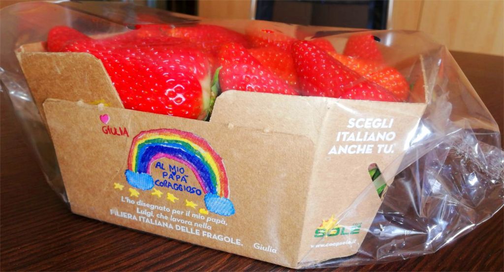 Cosa ha di diverso questo packaging un po’ insolito? “Alcuni elementi che, in questo momento, definirei essenziali: esplicita gratitudine per le persone impegnate quotidianamente nell’ambito produttivo, invito a scegliere prodotti italiani e una comunicazione che va a sostegno dell’intera filiera e non solo di Coop Sole – continua Ciardiello -. Per realizzarlo abbiamo affidato la creatività esclusivamente ai bambini, figli di dipendenti della cooperativa, che si sono cimentati, come tanti della loro età, con il tema grafico del momento: l‘arcobaleno appunto. Ognuno però è stato lasciato libero di esprimere una sua emozione da dedicare ai genitori e di apporvi poi la propria firma”.