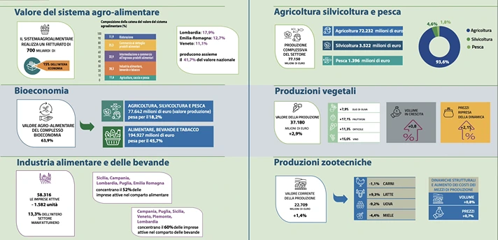 Il sistema agroalimentare italiano nello scorso anno ha totalizzato un fatturato di circa 700 miliardi di euro, circa 15% di quello complessivo dell’economia nazionale, confermandosi un settore cardine della nostra economia, con agricoltura e industria alimentare e delle bevande a rappresentare il 40% circa del valore totale. Questo nonostante il 2024 sia stato un anno complesso, segnato da tensioni geopolitiche, fragilità delle catene logistiche, volatilità dei mercati e sfide ambientali.