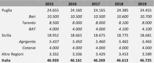 Restano stabili le superfici: 46mila ettari concentrati tra Puglia e Sicilia (oltre il 94% della produzione nazionale). E sembra essere in corso il tentativo di adeguare le varietà ai cambiamenti della domanda attraverso l’eliminazione dei vecchi impianti di varietà tradizionali a favore di vigneti a varietà apirene. Questi cambiamenti stanno influenzando la ripartizione provinciale della produzione, con una flessione degli investimenti nella provincia di Taranto e incrementi su altri areali pugliesi.