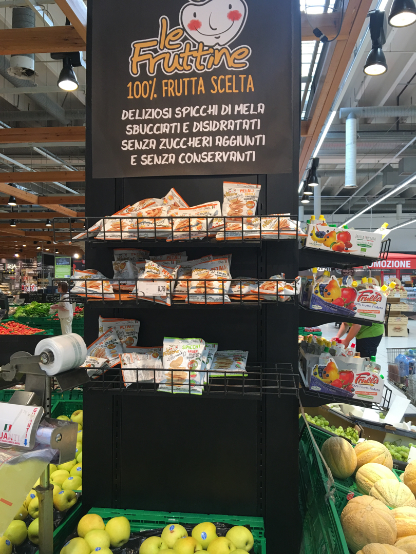 Non solo cross selling con altri prodotti – ad esempio gli snack di mela vicino alle mele – ma anche cross merchandising ben orchestrato: colpisce sicuramente l’Amuchina vicino agli ortaggi con dispenser e comunicazione studiata ad hoc, non tanto perché non sia centrato l’accostameno – anzi, esattamente il contrario – quanto perché è un’operazione partita da poco tempo e che, quindi, desta inizialmente un certo stupore quando la si osserva per la prima volta.