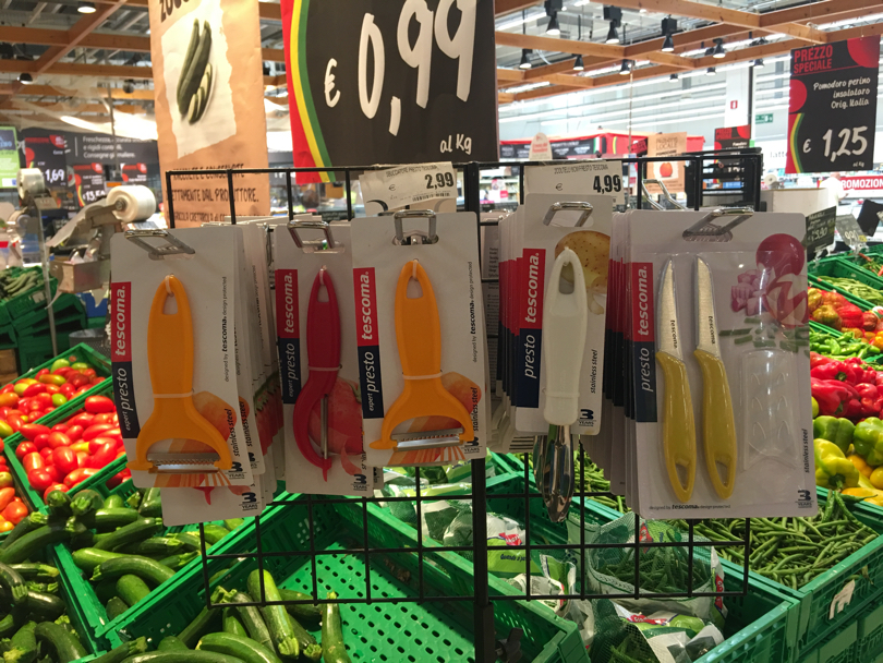 Poi spazio a tutta l’infinita oggettistica presente sul mercato e che serve per tagliare, intagliare, spremere, rompere e via discorrendo tutte le infinite referenze che popolano il reparto ortofrutta. Oggetti che, quando presenti nell’assortimento di un supermercato, spesso sono confinati in scaffali di reparti non tra i più frequentati e visibili. Accostare per funzionalità d'uso, più che sempre e solo per fisse categorie merceologiche è una mossa molto più intelligente e utile di quanto si possa credere. Anche nel reparto ortofrutta.