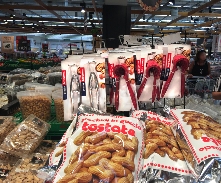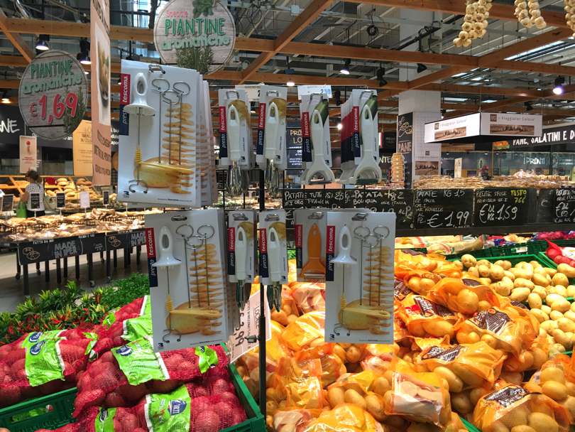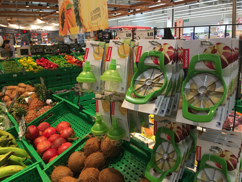 Praticamente lungo tutti i lati del reparto ortofrutta di questo interessante punto vendita abruzzese – anche qui, come in molti altri negozi della stessa insegna presenti altrove l’area dei freschi e freschissimi rappresenta sicuramente un fiore all’occhiello degno di nota – l’oggettistica in vendita legata a determinati prodotti è un tratto distintivo che non passa inosservato.