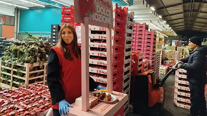 Nel mercato della città lombarda c'è un forte interesse alle fragole di qualità. Una promozione dedicata alla Rossetta ha visto una forte partecipazione dei fruttivendoli e degli altri operatori locali che apprezzano questa fragola che sta riscuotendo un buon successo di mercato, come testimonia Federico Fapanni nello stand di OrtoBergamo.