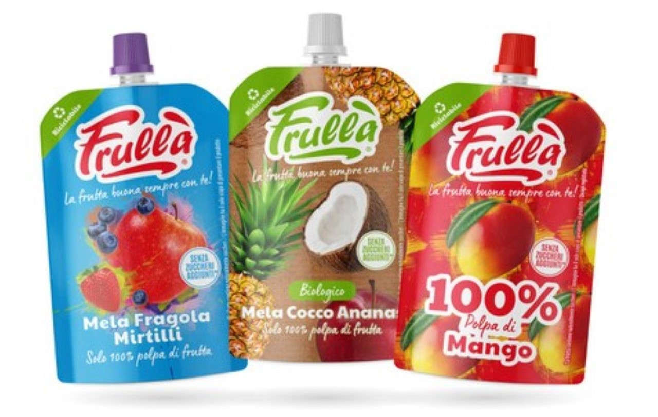 Il restyling ha interessato tutti i prodotti e per l’occasione sono stati leggermente modificati anche i nomi delle linee: Frullà Classico diventa semplicemente Frullà, la linea Bio si estende in Biologico, la linea Puro (monogusto) diventa 100% rendendo immediatamente chiaro il suo valore aggiunto. Infine, ma non per importanza, il nuovo packaging sarà anche monomateriale per tutte le linee: un doypack con tappo richiudibile, senza alluminio e quindi totalmente riciclabile nella plastica.