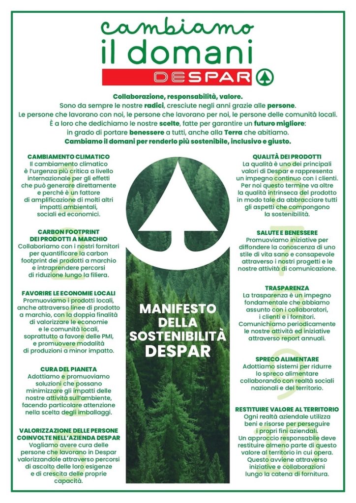Il Manifesto, declinato in dieci punti, è la carta dei valori che racconta come il marchio dell’Abete interpreta il ruolo di impresa socialmente responsabile e sostenibile e che raccoglie i principi con cui Despar Italia intende tradurre le sfide della sostenibilità in azioni che caratterizzano e valorizzano le scelte di business e l’impegno per la creazione di valore sociale, ambientale e di benessere delle persone, in linea con gli obiettivi di sviluppo sostenibile dell’Agenda Onu 2030.