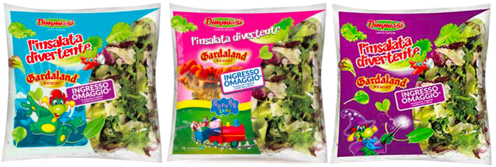 Tornano anche quest'anno le insalate in edizione limitata DimmidiSì “L'insalata Divertente” grazie alla collaborazione con Gardaland Resort. Si tratta di un’insalata mista presentata in tre versioni differenti: due hanno come soggetto Prezzemolo, il draghetto verde con i capelli rossi, nelle vesti classiche e travestito da maghetto (in linea con il tema magico che traina la comunicazione Gardaland nel 2019), mentre la terza ha come protagonista Peppa Pig che i bambini potranno incontrare dal vivo a Gardaland Peppa Pig Land.