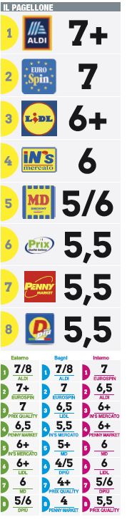 Il podio vede protagonisti Aldi, Eurospin e Lidl. La prima classificata, sbarcata in Italia nel 2018, raccoglie il giudizio più alto dell'indagine, distinguendosi per l'attenzione alla cura e alla pulizia dei parcheggi esterni e dei carrelli, ma anche per la piacevolezza e l'ordine dei propri punti vendita, così come per uno scrupoloso occhio di riguardo ai servizi igienici.