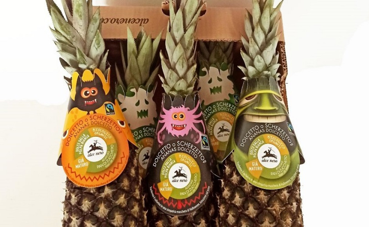Dolcetto o scherzetto? Il ben noto adagio tipico della festa nata in America è quanto mai adatto all'innovativa iniziativa messa in campo da Alce Nero e dal socio Brio per valorizzare l'ananas Dolcetto, il frutto protagonista di un importante progetto di cooperazione internazionale di Coopermondo, certificato Fairtrade e biologico. In occasione di Halloween, l'ananas proveniente dal Togo si distinguerà a scaffale grazie a una serie di quattro collarini a tema che potranno trasformarsi in altrettante maschere per il divertimento di bambini e adulti.