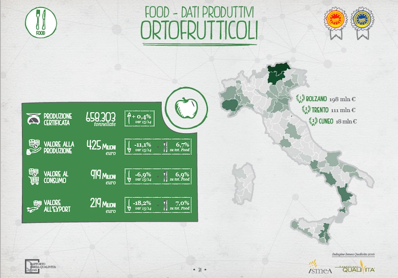 I prodotti ortofrutticoli incidono per il 7% sul valore della produzione dell'intero comparto food Dop e Igp e restano la categoria leader in termini di volumi, ma nel 2015 il valore alla produzione ha subito un calo dell'11% mentre i volumi sono rimasti sostanzialmente invariati. I risultati della categoria dipendono soprattutto dai trend della Mela Alto Adige Igp (-12% volume e -20% in termini di valore) e della Mela Val di Non Dop (+12% volume ma -12% valore) che rappresentano da sole l'83% della produzione certificata. La frenata vale anche per le esportazioni, -18,4 la Mela Alto Adige e -14% la Mela Val di Non.