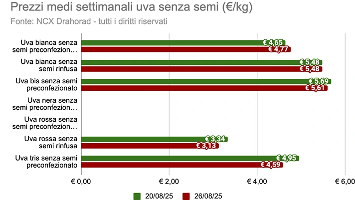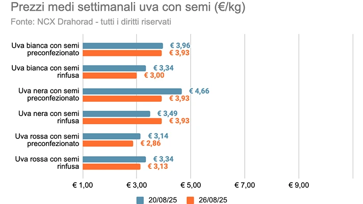Il prezzo medio della categoria è stato pari a 4,33 euro il chilo, con una variazione del -1,0% rispetto alla settimana precedente. Il prodotto con il prezzo per chilo mediamente più basso è l'uva rossa con semi (3,05 euro il chilo), con una variazione del -4,3% rispetto alla settimana precedente.