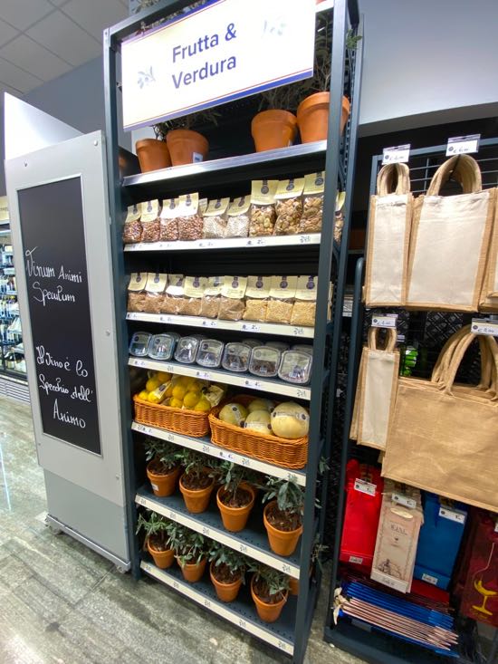 Il format è di fatto un progetto all’inizio della sua avventura e quindi cambiamenti, modifiche, aggiornamenti, sono da mettere in cantiere, per stessa ammissione dei manager presenti all’inaugurazione. Lo spazio riservato ai freschissimi e all’ortofrutta in particolare, per ora è una semplice presenza quasi decorativa, come testimonia l’immagine che abbiamo scattato all’interno del punto di vendita, con due referenze fresche (limoni e meloni) e qualcosa in più per quanto riguarda semi e frutta secca. Nulla vieta, però, che in futuro, a seconda del contesto nel quale verranno aperti i possibili futuri negozi Terre d’Italia, non venga dato più spazio anche a frutta e verdura, referenze che Carrefour, nei suoi classici supermercati, commercializza anche con questo marchio premium naturalmente.