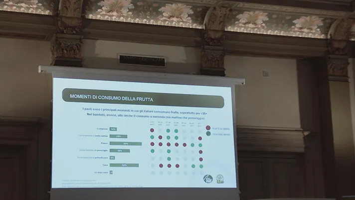 Claudia Iannnarella, responsabile marketing Valfrutta Fresco, ha presentato i risultati della ricerca NielsenIQ condotta per Alegra che fotografa le abitudini degli italiani nel consumo di frutta e individua il consumatore tipo. La frutta è preferita dalle donne (54%) e particolarmente gradita dagli over 65, che rappresentano il 26% dei consumi, mentre la fascia 54-64 si attesta intorno al 16-17%.