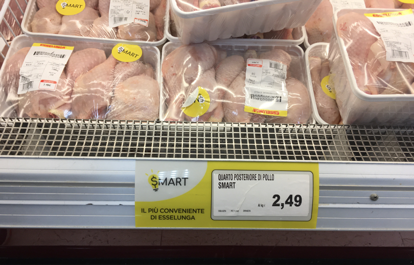 Restando all'area dei freschi e freschissimi, sempre nello stesso punto di vendita, nel reparto carni sono presenti già cinque referenze Smart, con un'etichetta prezzi in questo caso maggiormente in evidenza e ben visibile un po' come negli altri reparti.