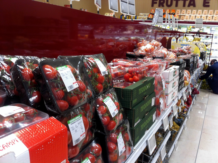 Nell’articolo di Retail Watch si sottolinea la grande varietà di pomodori presenti. Una segmentazione notevole, in effetti: 2 referenze sfuse da pesare, 5 confezionate nell’area biologica e ben 12 nella parte finale del reparto. Un’offerta complessiva ricca, non così facile da trovare altrove, che non punta molto sulla presentazione – sostanzialmente spartana l’esposizione – quanto sulla ricchezza di varietà e provenienza: si va dal pomodorino del Piennolo Vesuviano venduto in cassetta a quello di Pachino, passando per i pomodorini sardi, quelli ovali cencara, i pizzutelli, i datterini siciliani e così via. Insomma, nel complesso niente “effetti speciali” nel reparto ortofrutta, ma certamente molta “sostanza”, e in poco spazio.
