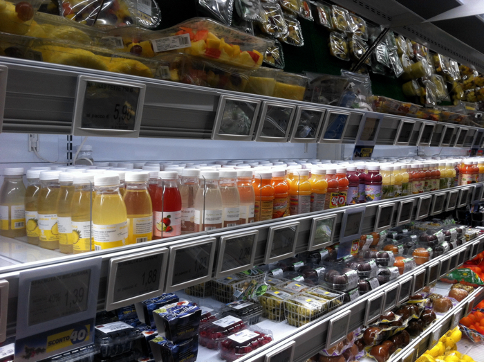 Molto fornita l’area spremute fresche di frutta e frullati – abbiamo contato 16 referenze con gusti differenti, quasi tutti dell’azienda Macè – posizionata vicino a quella dedicata alla frutta di IV gamma, un’altra categoria ben presente per varietà e profondità nell’assortimento, certamente più di quanto lo sia di solito.