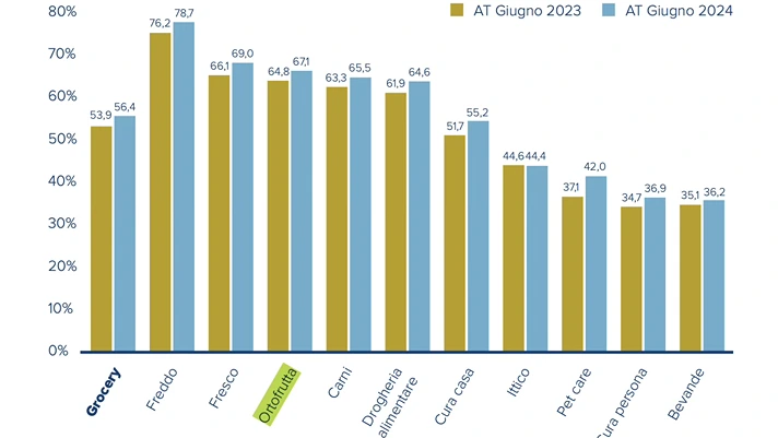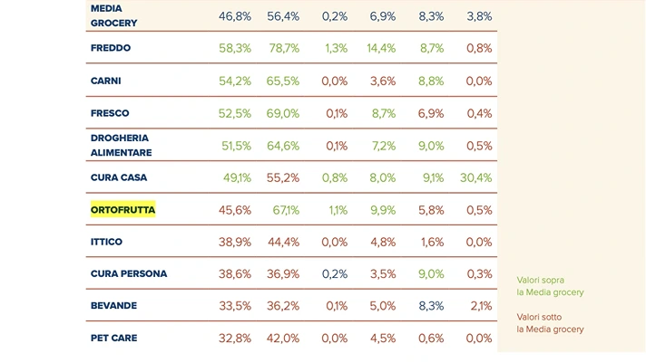 Quanto al reparto ortofrutta, il report ha incluso tutti i prodotti freschi, compresi quelli di IV e V gamma. Sono invece esclusi dall'analisi i prodotti ortofrutticoli conservati in freezer e congelatori, la frutta conservata, anche sotto spirito, e la frutta secca.
