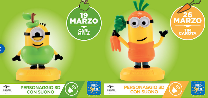 Per ricevere i personaggi (3D e parlanti) della collezione è necessario recarsi nei negozi Eurospin ogni sabato a partire da oggi, 19 marzo, ed effettuare una spesa di almeno 30 euro. La prima uscita – oggi – ha come protagonista Carl Mela che sarà seguito da: Tim Carota (26 marzo); Jerry Pomodoro (2 aprile); Kevin Banana (9 aprile); Bob Fragola (16 aprile) e Dave Peperone (23 aprile).