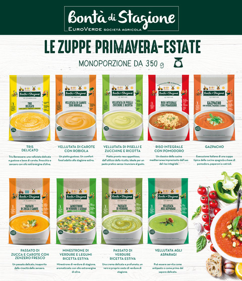 “La voglia di stupire e deliziare i palati è in primo piano anche nella primavera-estate con Euroverde e il suo brand premium Bontà di Stagione -continua la nota- In rapida successione facciamo una sorta di questa anteprima di gusti, presentando nove referenze monoporzione (350 grammi). Sono il tris delicato, vellutata armoniosa e gustosa a base di carote, finocchio e zenzero con olio extravergine d’oliva; la vellutata di carote e robiola, un comfort food perfettamente adatto alla stagione estiva; la vellutata di piselli, zucchine e ricotta, ideale come piatto pratico e gustoso; il riso integrale con pomodoro, piatto tipico della cucina mediterranea impreziosito dall’uso del riso integrale; il gazpacho, un’esecuzione italiana di una zuppa tipica della cucina spagnola, ideale anche servito freddo, a base di pomodoro, peperoni e cetrioli; e, ancora, il passato di zucca e carote con zenzero fresco; il minestrone di verdure e legumi in versione estiva; il passato di verdure, crema delicata e profumata esaltata dalle verdure di stagione; infine la vellutata agli asparagi, ideale sia come antipasto che primo dal sapore delicato”.