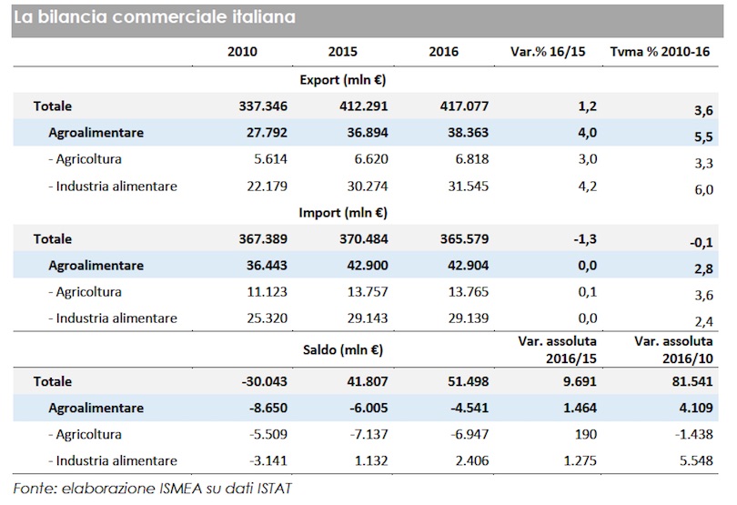 Il rapporto mette in luce, a livello generale, come nel 2016 si sia evidenziata una significativa riduzione del deficit in valore grazie all'aumento delle esportazioni che hanno raggiunto 38,4 miliardi di euro (+4%) grazie alle vendite sia dei prodotti agricoli (+3% sul 2015) che soprattutto di quelli alimentari trasformati (+4,2%). Stabili, invece, l'anno scorso le importazioni alimentari (42,9 miliardi), a causa della debolezza della domanda interna, che ha consentito così “il recupero del disavanzo per un valore di poco inferiore a 1,5 miliardi di euro”.