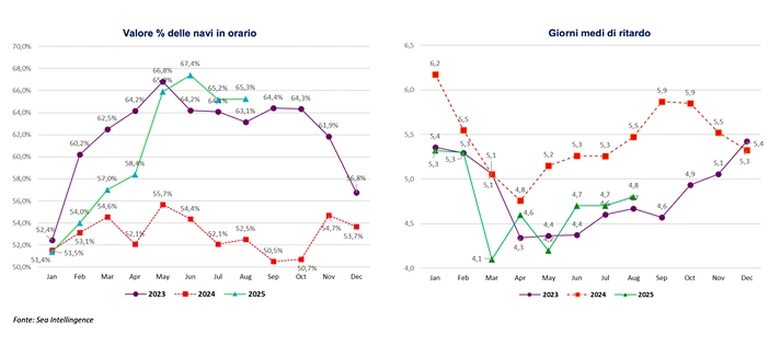 La qualità dei servizi marittimi è migliorata nel 2025, superando a metà anno i livelli del 2023. Le navi arrivate in orario sono state in media circa il 62% (rispetto al 53% del 2024), con un ritardo medio di 4,7 giorni (rispetto ai 5,3 dell’anno precedente).